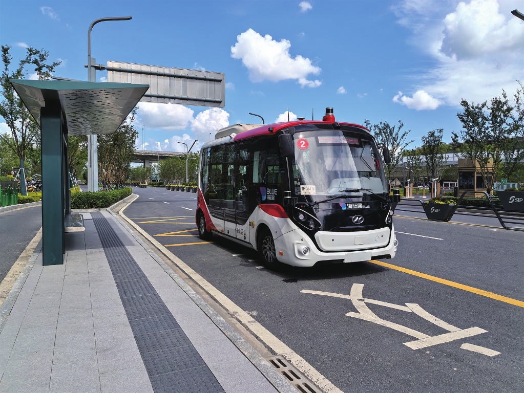近日,蘇州首條無(wú)人駕駛巴士線路——陽(yáng)澄數(shù)谷示范線免費(fèi)開(kāi)放全民試乘體驗(yàn)。圖為昨日無(wú)人駕駛巴士行駛在路上。(視覺(jué)蘇州供圖)