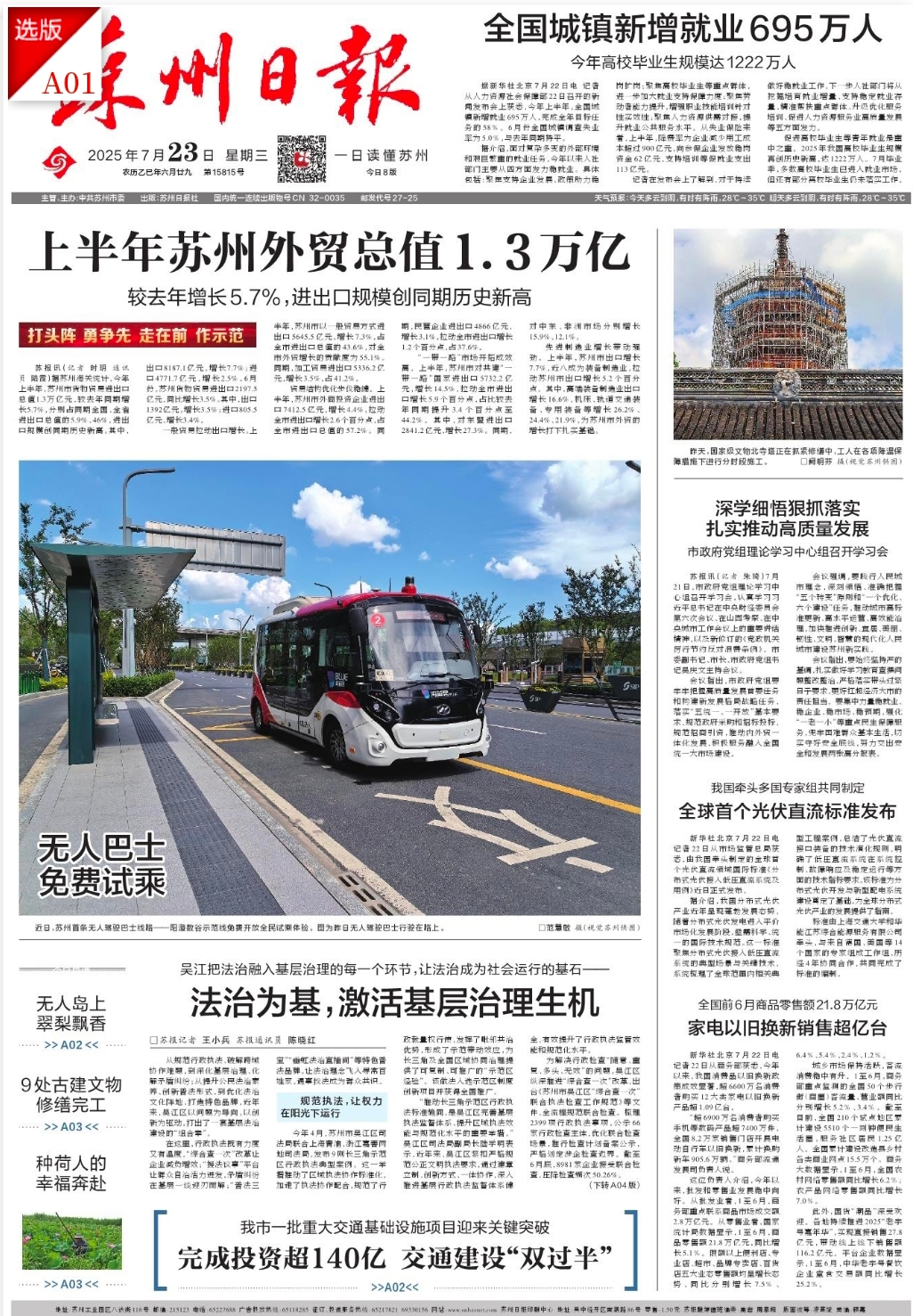《蘇州日?qǐng)?bào)》2025年07月23日A01版