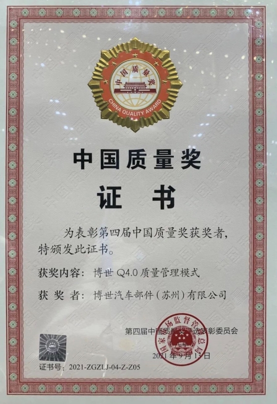 2021年,博世汽車部件(蘇州)有限公司憑借“博世Q4.0質量管理模式”榮獲第四屆中國質量獎,成為汽車零部件行業數字化質量管理的全球標桿,也是全國首個獲中國質量獎的外資企業,實現了蘇州市中國質量獎零的突破。