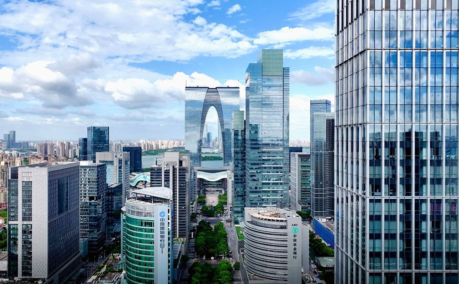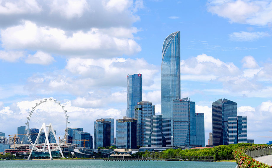 金雞湖右岸重點項目加快建設,涌動著發展活力,“蘇州之眼”摩天輪等地標建筑引得游人駐足流連。