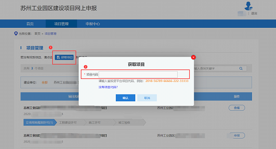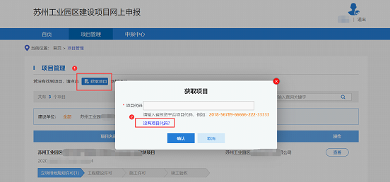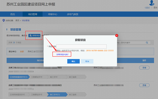 1.2.2. 如果本單位的項目(新拿地、已有地新建等有發改項目代碼的項目)未展示出來,則點擊“獲取項目按鈕”,在項目代碼欄輸入項目代碼獲取項目,點擊“確認”按鈕獲取。