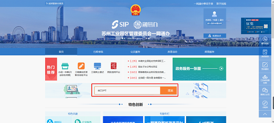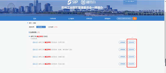 在“一網通辦”首頁搜索框中輸入“施工許可”相關關鍵字后,點擊搜索
