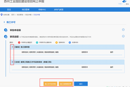 勾選所需辦理的事項前面的復選框,如果所需辦理事項涉及到施工許可證和施工圖審查,則下方會出現兩個黃色的“施工許可證申報”“施工圖審查申報”按鈕,點擊按鈕會分別跳轉到對應的平臺辦理對應的業務,其他無需跳轉辦理的辦件,仍在工程建設項目網上申報平臺上傳材料。跳轉提交所需的施工圖審查和施工許可證材料之后,必須在工程建設網上申報平臺點擊藍色的“提交”按鈕,才能提交工改審批端審批,并且點擊“提交”按鈕才會給施工許可和施工圖審查系統發送待辦提醒。