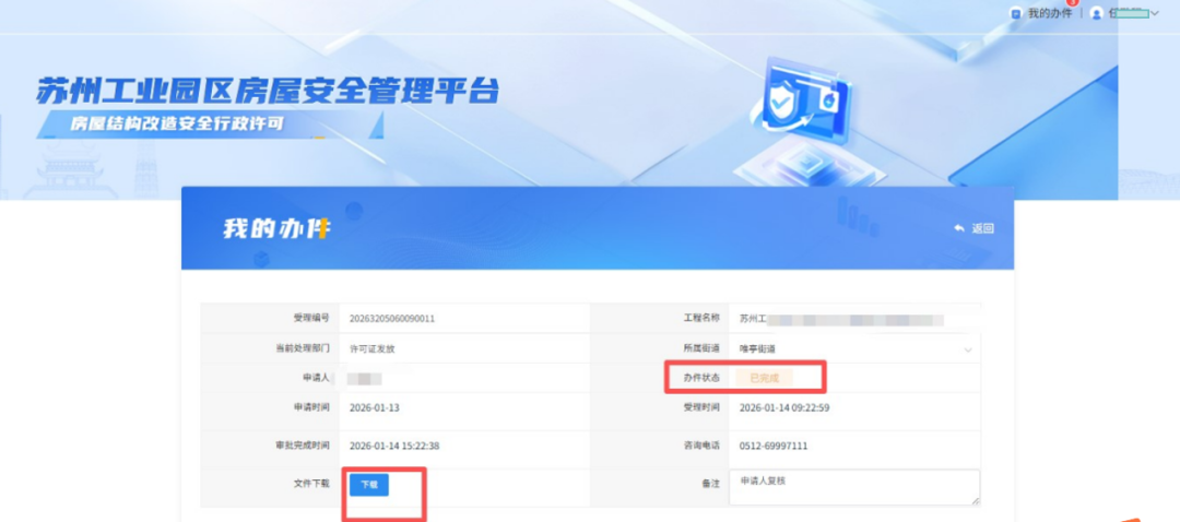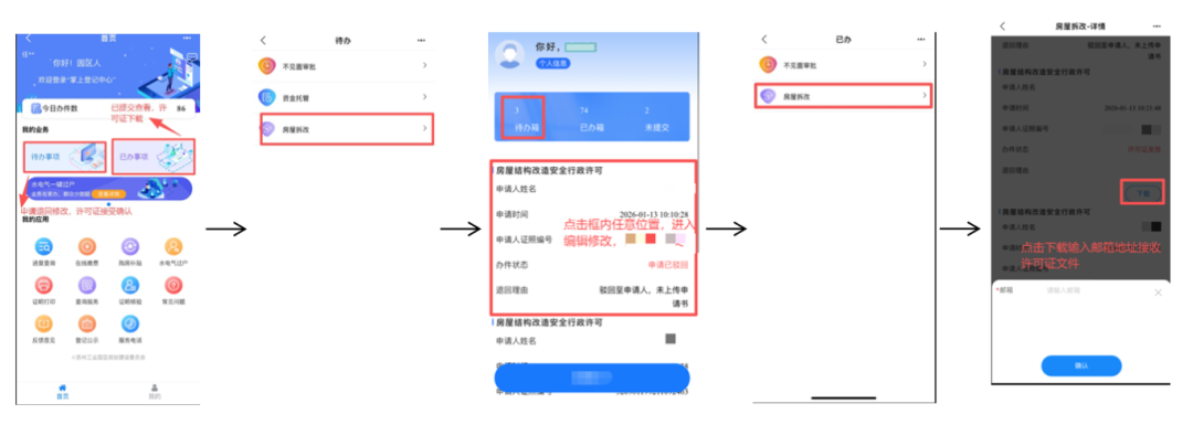 系統會在全部完成審批或者退回修改時,發送短信至申請人手機號提醒,登錄互聯網+房產交易平臺的待辦、已辦列表,完成修改后提交及許可證接收。