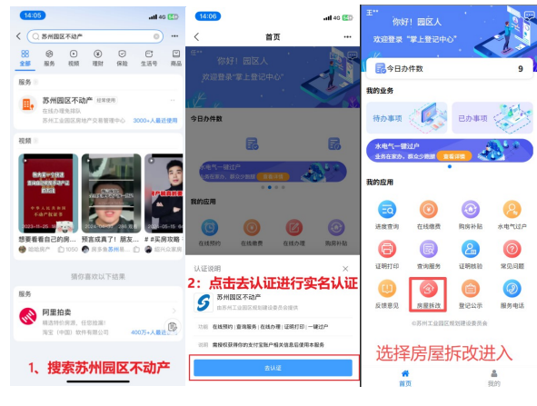 (1)支付寶端:打開支付寶-搜索蘇州園區不動產-點擊進入首頁,選擇房屋結構改造許可進入。