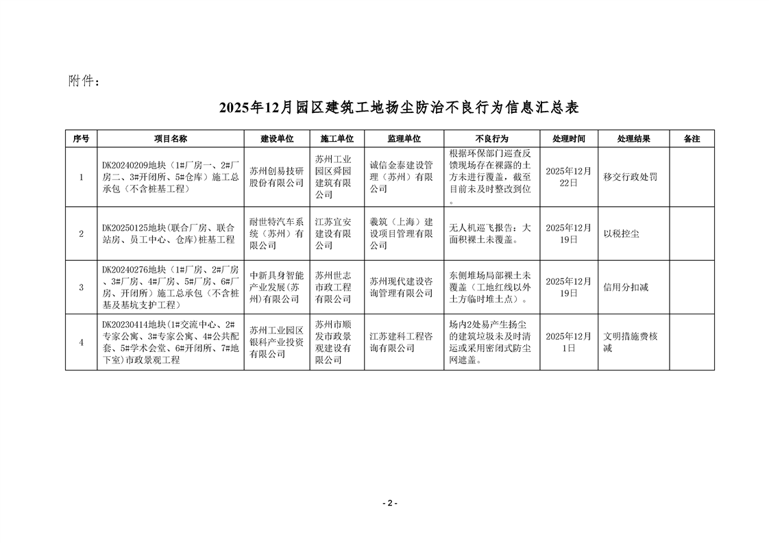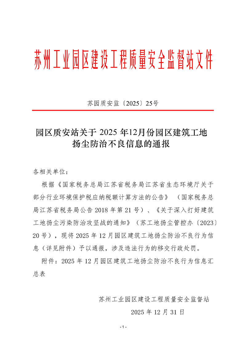 園區(qū)質(zhì)安站關(guān)于2025年12月份園區(qū)建筑工地揚塵防治不良信息的通報