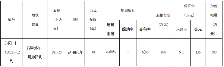 6、成交通知:地塊成交后,網(wǎng)上出讓系統(tǒng)自動(dòng)生成《網(wǎng)上掛牌出讓成交通知書》。競得人應(yīng)按成交通知書要求,于該地塊網(wǎng)上出讓系統(tǒng)確認(rèn)競得之日起5個(gè)工作日內(nèi)(最晚于2023年9月4日16:00前),持成交通知書及有效證件原件、復(fù)印件等提交蘇州工業(yè)園區(qū)土地儲(chǔ)備中心進(jìn)行競買資格審查。