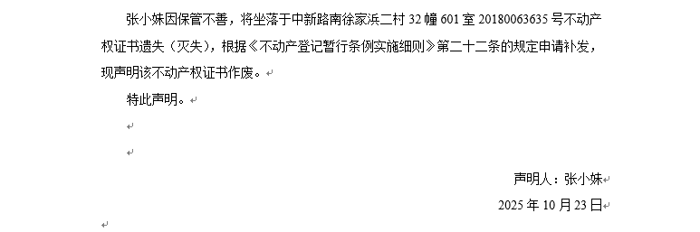 關于中新路南徐家浜二村32幢601室20180063635號不動產權證書遺失聲明
