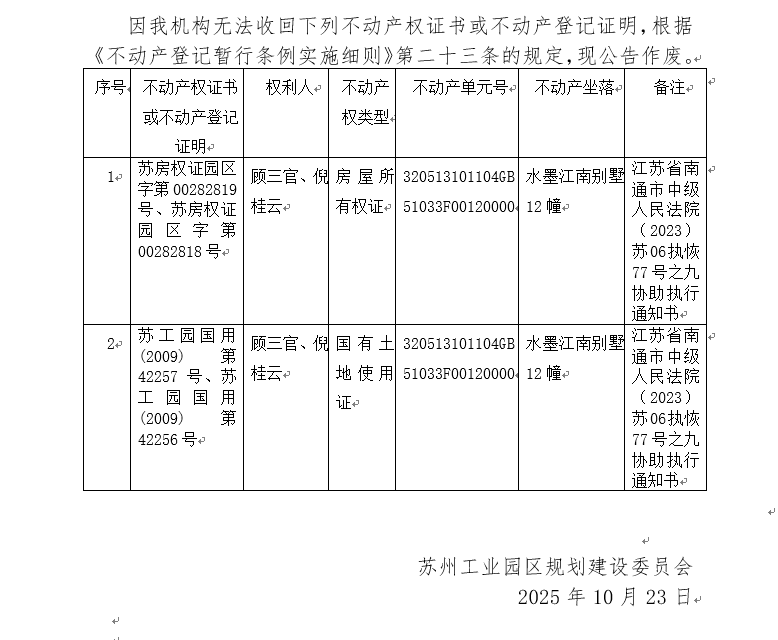 不動產(chǎn)權(quán)證書/登記證明作廢公告蘇園 證廢字2025(0168)號(水墨江南別墅12幢)