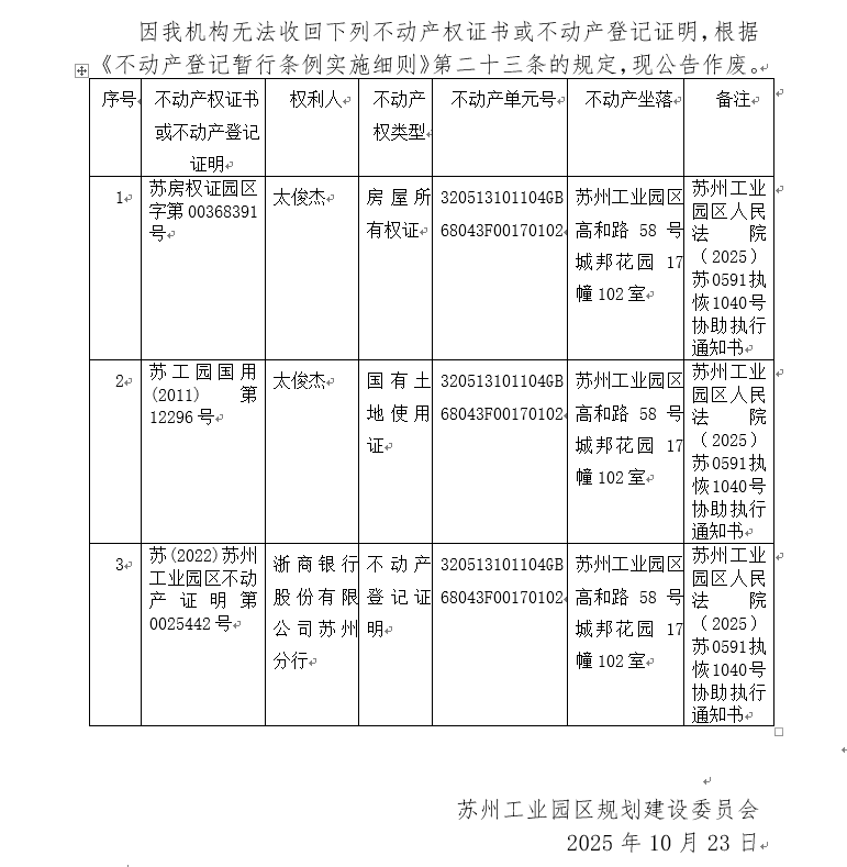 不動產權證書/登記證明作廢公告蘇園 證廢字2025(0170)號(城邦花園17幢102室)