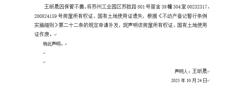 關于蘇州工業園區蘇勝路801號麗舍39幢304室00232317、200824159號房屋所有權證、國有土地使用證遺失聲明