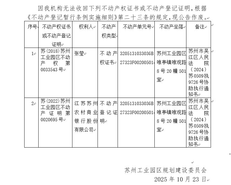 不動產權證書/登記證明作廢公告蘇園 證廢字2025(0165)號(唯觀路8號20幢501室)