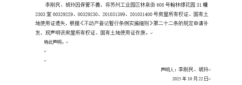 關(guān)于蘇州工業(yè)園區(qū)林泉街608號(hào)翰林緣花園31幢2303室00329229、00329230、201031399、201031400號(hào)房屋所有權(quán)證、國(guó)有土地使用證遺失聲明