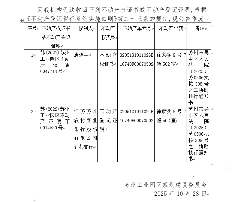 不動產權證書/登記證明作廢公告蘇園 證廢字2025(0163)號(徐家浜8號7幢502室)