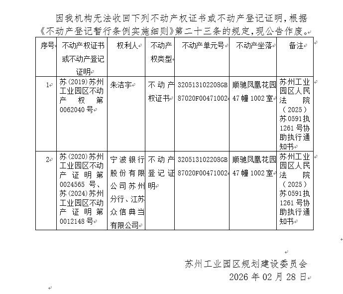 不動產權證書/登記證明作廢公告蘇園 證廢字2026(0052)號(順馳鳳凰花園47幢1002室)