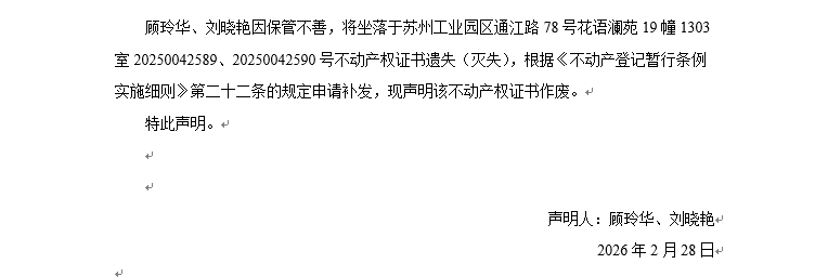 關(guān)于蘇州工業(yè)園區(qū)通江路78號花語瀾苑19幢1303室20250042589、20250042590號動產(chǎn)權(quán)證書遺失聲明