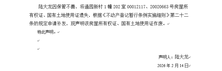 關于通園新村1幢202室00012117、20020663號房屋所有權證、國有土地使用證遺失聲明