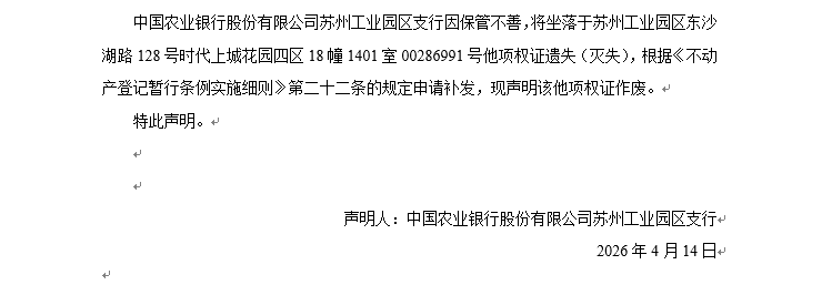 關于蘇州工業園區八達街99號月亮灣美頌花園5幢501室00286991號他項權證遺失聲明