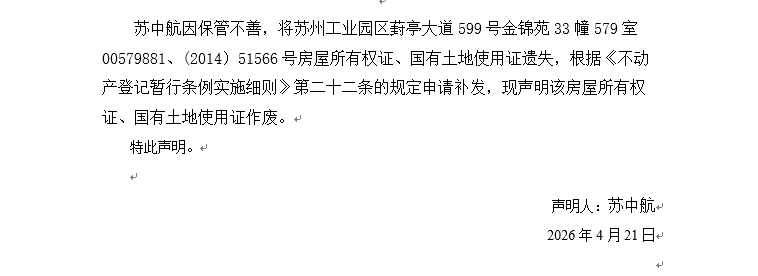 關于蘇州工業園區葑亭大道599號金錦苑33幢579室00579881、(2014)51566號房屋所有權證、國有土地使用證遺失聲明
