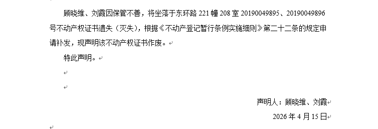 關(guān)于東環(huán)路221幢208室20190049895、20190049896號(hào)不動(dòng)產(chǎn)權(quán)證書遺失聲明