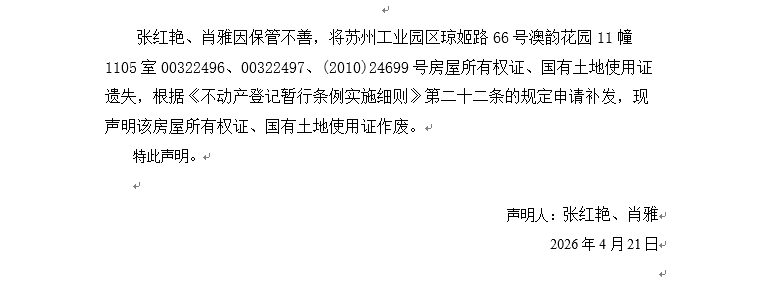關于蘇州工業園區瓊姬路66號澳韻花園11幢1105室00322496、00322497、(2010)24699號房屋所有權證、國有土地使用證遺失聲明