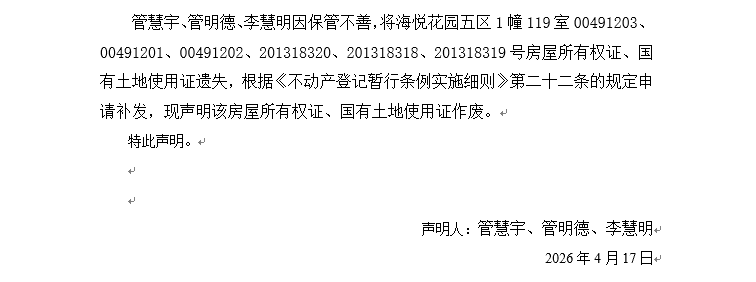 關(guān)于海悅花園五區(qū)1幢119室00491203、00491201、00491202、201318320、201318318、201318319號(hào)房屋所有權(quán)證、國(guó)有土地使用證遺失聲明