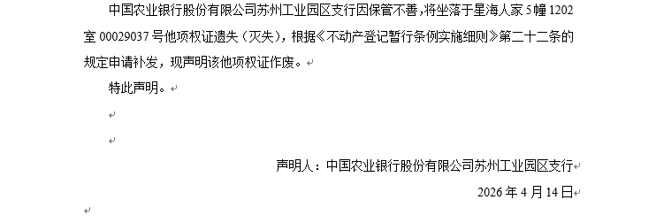 關于星海人家5幢1202室00029037號他項權證遺失聲明