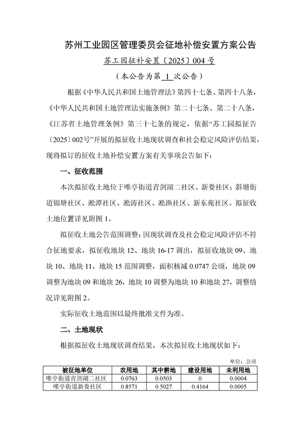蘇州工業(yè)園區(qū)2025年度第4批次城市建設(shè)用地--蘇州工業(yè)園區(qū)管理委員會征地補償安置方案公告(蘇工園征補安置〔2025〕004號)