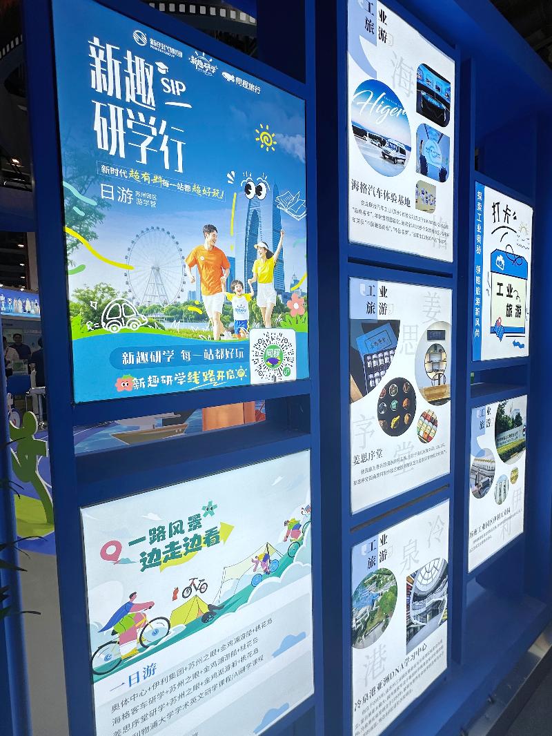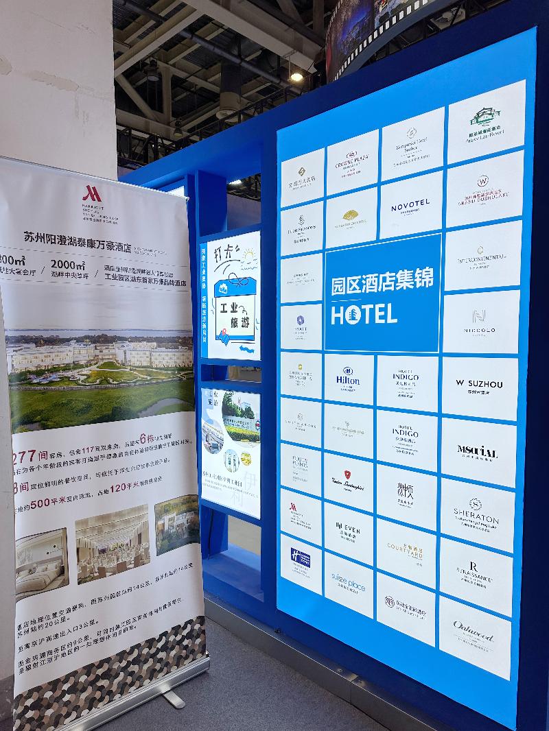展廳中央更是藏著不少驚喜?!盎萦螆@區”智慧文旅平臺的成果讓人眼前一亮,今年上半年,平臺總交易額破億元,注冊用戶達163.2萬人,成為園區商旅文體展集成服務主門戶;工業旅游區集中展示四大特色工業旅游點及“新趣研學”主題研學線路,詮釋“旅游+工業”創新實踐;近40家品牌酒店組成的LOGO集錦墻,彰顯園區作為兼具國際范、煙火氣與人文韻的文旅目的地的吸引力,亦是“宜居宜業宜游”創新之城的生動注腳。