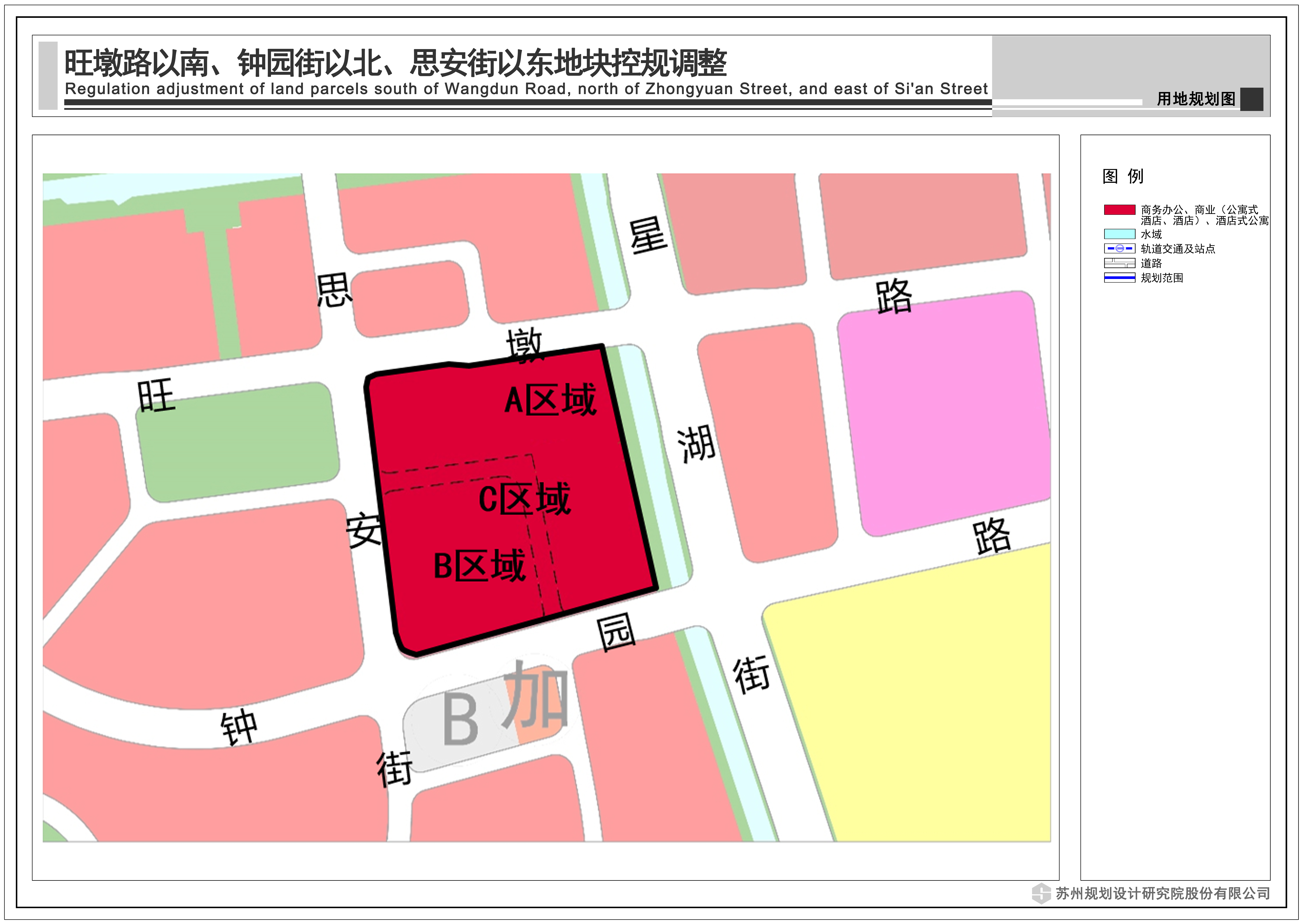 為滿足經(jīng)濟社會發(fā)展需求,調(diào)整用地性質(zhì)為商務(wù)辦公、商業(yè)(公寓式酒店、酒店)、酒店式公寓混合用地,明確地塊規(guī)劃控制指標及A區(qū)域、B區(qū)域、C區(qū)域3個區(qū)域的控制內(nèi)容,其中規(guī)劃建筑高度限高380米。