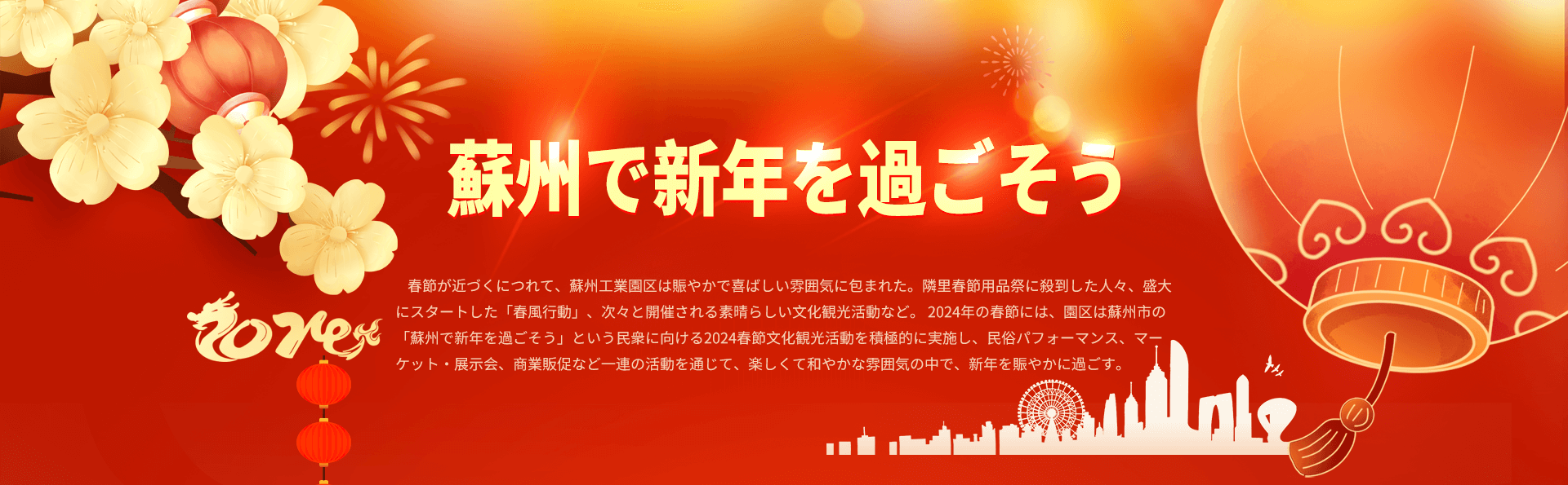 春節(jié)期間中、金鶏湖音楽噴水は一晩に二回公演した。華誼兄弟映畫楽園では春節(jié)をテーマにした燈籠祭が開催され、ビスタ-蘇州ショッピングビレッジでは春節(jié)のパレードが催され、重元寺では春節(jié)の祝福イベントが行われた。