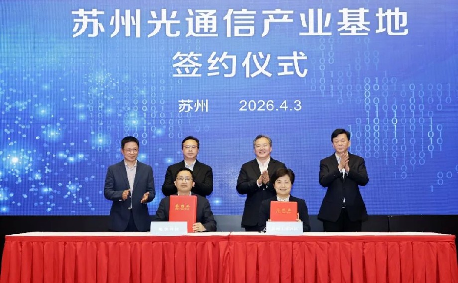 4月3日、蘇州光通信産業基地調印式が行われた。蘇州市委員會書記の範波氏、蘇州旭創科學技術有限公司創始者兼最高経営責任者の劉聖氏が調印式に出席し、共に蘇州光通信産業基地及び産學研協力プラットフォームの除幕を行った。