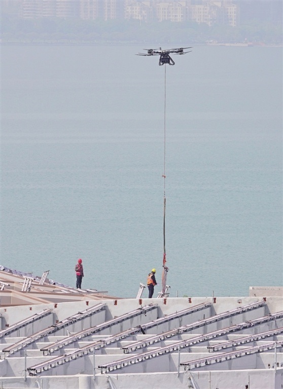 4月5日、園區の鐘園路にある工事現場で、作業員がドローンを使って吊り上げ作業を行い、作業効率と安全性が大幅に向上した。