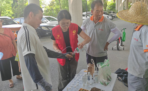 活動通過創意海報展示、養生知識分享及互動體驗環節,向居民傳遞了豐富的夏季養生知識。海報圍繞“夏季飲食調養”“防暑降溫小貼士”“運動養生法”等多個主題展開,圖文并茂地介紹了如何在夏季保持身體健康。最吸引眼球的莫過于自制驅蚊水環節。居民們將簡單易得的材料按比例混合,一瓶既安全又有效的驅蚊水便誕生了。這種自制驅蚊水不僅能有效驅趕蚊蟲,還避免了使用化學驅蚊產品可能帶來的健康風險,真正實現了綠色健康的防蚊新風尚。