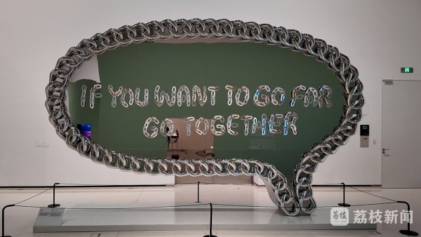 中國當代藝術領域的標志性人物徐震創作的巨型裝置《結伴才能行遠》,涂鴉般的文字外圍被一條銀色長鏈緊緊圈起,充滿激情的宣言被放入線條挺拔的對話框:“IF YOU WANT TO GO FAR,GO TOGETHER”。這句鏗鏘有力的“結伴才能行遠”,擲地有聲地點明了此次展覽的愿景:中新兩國文化交流面向未來、攜手并進。
