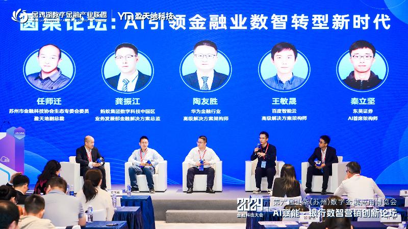 本次論壇還就《AI引領金融業數智轉型新時代》主題展開圓桌對話,深度探討數字化浪潮下AI大模型在金融行業的應用與挑戰,并針對當下金融機構數字轉型過程中普遍存在的問題給出建議。圓桌對話邀請蘇州市金融科技協會生態專委會委員、盈天地副總裁任師遷作為主持,螞蟻集團數字科技中國區業務發展部金融解決方案總監龔振江、華為金融行業高級解決方案架構師陶友勝、百度智能云高級解決方案架構師王敏晟、東吳證券AI首席架構師秦立堅4位GenAI大模型的應用下的不同角度分析探討金融數字化發展機遇。
