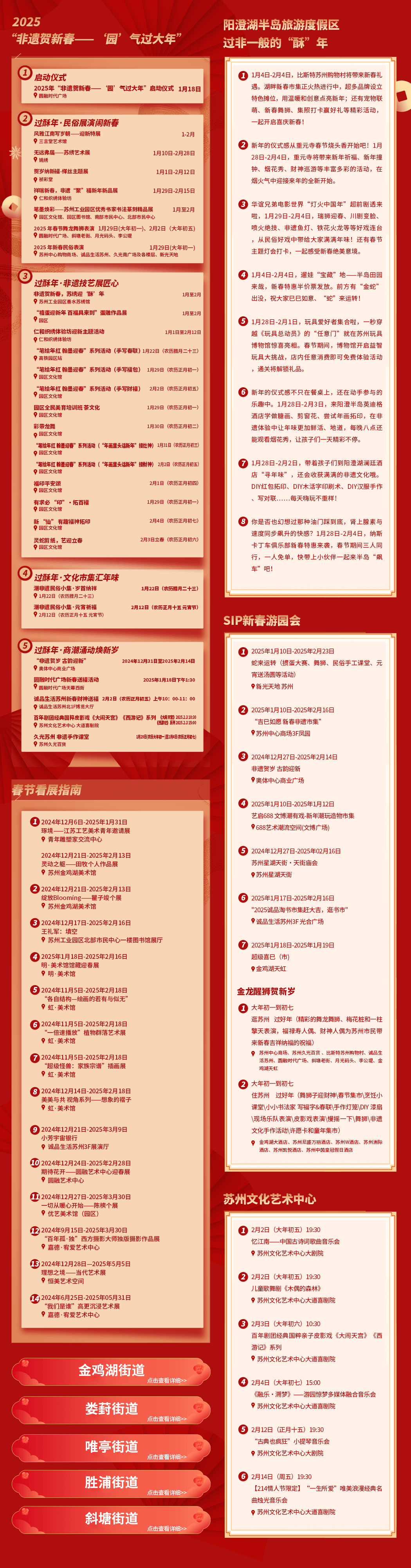 歲末年初,辭舊迎新。蘇州工業園區商貿載體聚焦重點時節、重點人群、重點需求,精心準備了系列精彩活動,全面釋放假日消費的潛力與活力。新春市集迎春納福開啟歡樂“GO(購)”用“新”驚喜集結新快樂,歡暢樂購快樂出發!蘇州中心商場里,一場“吉巳如愿新春非遺市集”正在持續進行。燈籠紙鳶、福字春聯相映成趣,篆刻、剪紙、刺繡、彩繪、木刻、絲編,以及古法香膏等25項承載深厚文化底蘊的傳統項目亮相3樓鳳園,傳遞非遺魅力。同時酸甜的冰糖葫蘆、酥脆的蘿卜絲餅、軟糯的打糕、香甜的蘇式海棠糕、拉絲的古法龍須糕等充滿煙火氣的美食,則以舌尖味蕾體驗打開濃濃的傳統年味記憶。同時,持續上新的新店、首店,也將為市民游... [詳細]