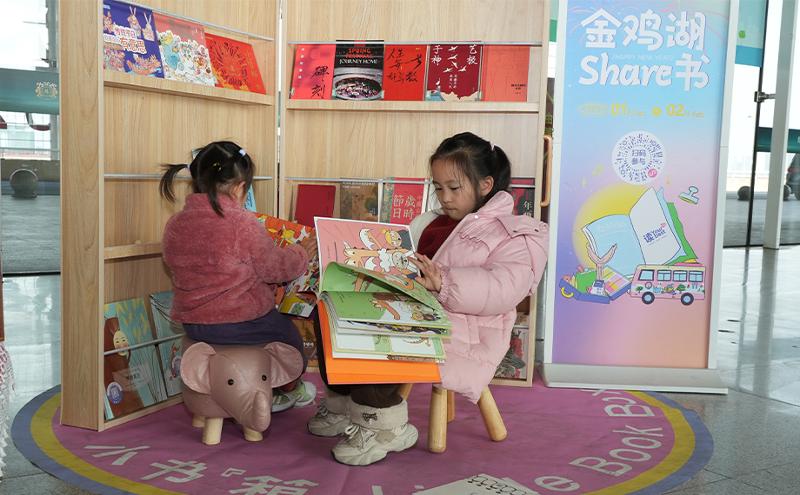 現場,玩法多樣的“金雞湖Share書”區同樣熱鬧非凡,吸引了眾多乘客駐足。扭蛋機內藏著新春福扇、徽章、文創日歷、雜志書刊等豐富獎品,大家踴躍參與,樂在其中。乘客們還可以在明信片、紅包等物品上親手蓋章,將滿滿的福氣和好運帶回家中。流動圖書車旁,不時有小朋友坐下,在車站的一隅靜靜地翻閱著書籍。