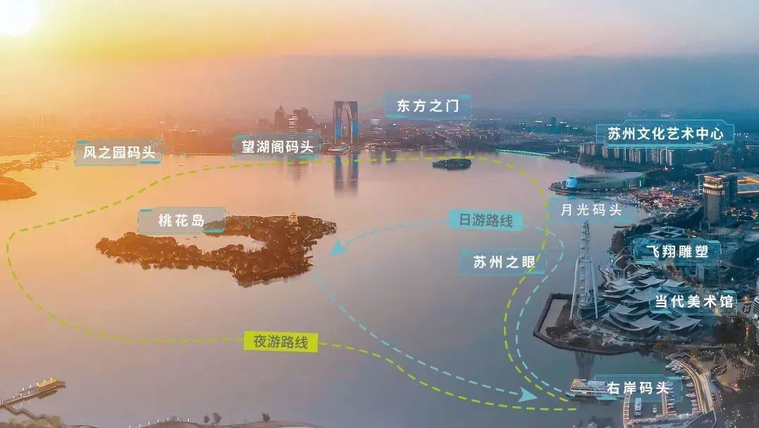 日游航線——登島線:沿途觀賞當(dāng)代美術(shù)館、“蘇州之眼”摩天輪、“飛翔”雕塑等城市地標(biāo)后,登上桃花島游覽。