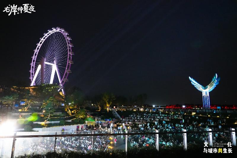 暮色漸沉,舞臺(tái)的燈光愈發(fā)耀眼,右岸客廳廣場(chǎng)的草坪上,觀眾們沿著坡度有序落“座”,翹首以待。