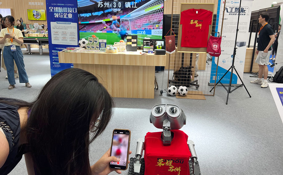 展會現(xiàn)場,人工智能應(yīng)用也與“蘇超”隔空對話。在蘇超互動區(qū),曾作為蘇超機器人領(lǐng)隊并在中場表演中展示魅力的明星機器人WAWA一邊移動一邊擺動手臂,與圍觀人群熱情互動。