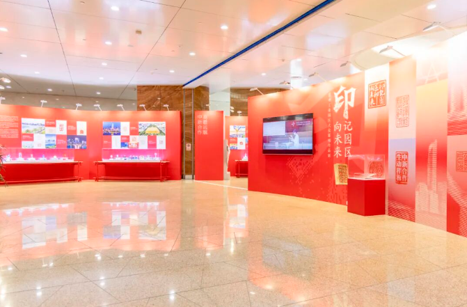 直播鏡頭跟隨導(dǎo)覽人的腳步,深入解讀了展覽的兩大構(gòu)成部分。第一部分“印記園區(qū)”以94枚全新創(chuàng)作的印章,構(gòu)建出“領(lǐng)航壁畫”“志合山海”“吳風(fēng)湖韻”“勇立潮頭”“盛世江南”五大篇章。這些作品不僅凝結(jié)了園區(qū)篆刻愛好者與專業(yè)工作者的創(chuàng)意巧思,更特別聚焦于園區(qū)的經(jīng)濟發(fā)展、科技創(chuàng)新、自然景觀與產(chǎn)城融合圖景進行創(chuàng)作,讓古老的篆刻藝術(shù)與園區(qū)的現(xiàn)代化發(fā)展深度交融。