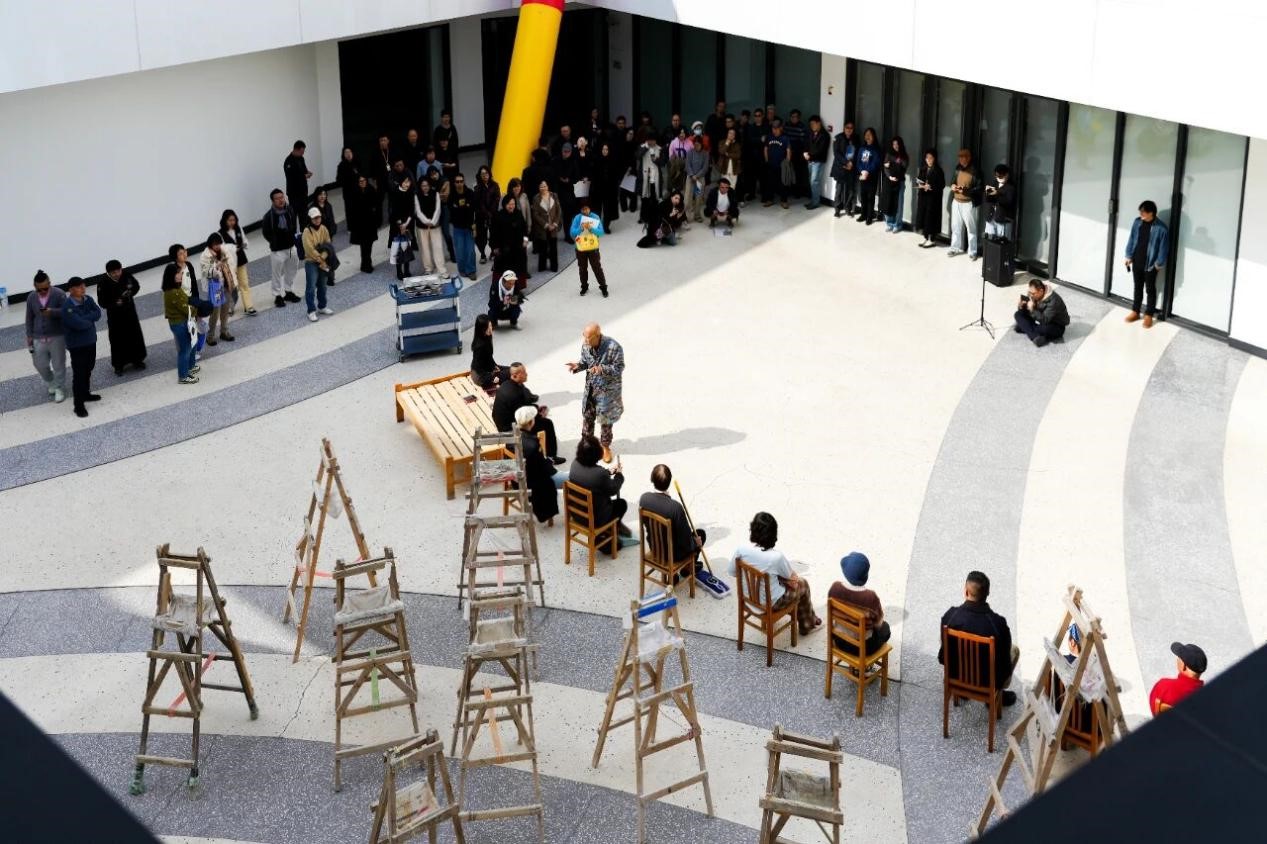 當(dāng)天,楊重光還在宥愛(ài)美術(shù)館戶(hù)外中庭,帶來(lái)特別的一課《一場(chǎng)關(guān)于身份的現(xiàn)場(chǎng)實(shí)驗(yàn)》。現(xiàn)場(chǎng)邀請(qǐng)觀(guān)眾親身參與,通過(guò)身體表達(dá)、材料運(yùn)用、即興回應(yīng)等形式,開(kāi)展一場(chǎng)關(guān)于“身份”的集體藝術(shù)實(shí)驗(yàn),讓在場(chǎng)者感知藝術(shù)并非專(zhuān)屬特權(quán),而是每個(gè)人與生俱來(lái)的能力。