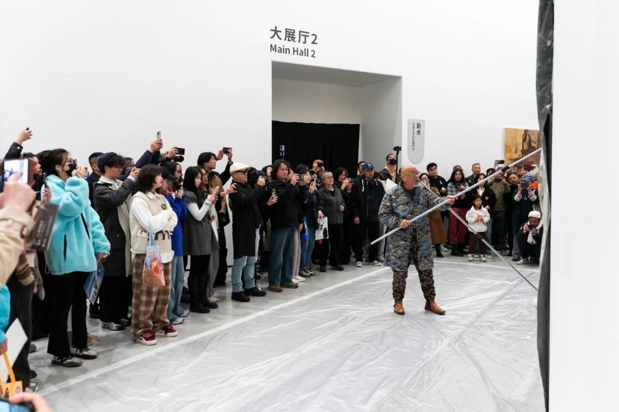 開(kāi)幕現(xiàn)場(chǎng),楊重光帶來(lái)即興藝術(shù)創(chuàng)作實(shí)踐,以舊帆布、廢紙、顏料等廢棄材料為創(chuàng)作媒介,將數(shù)十年人生閱歷與藝術(shù)思考融入創(chuàng)作,現(xiàn)場(chǎng)完成一件全新廢墟藝術(shù)作品。觀(guān)眾近距離觀(guān)摩作品從無(wú)到有的完整誕生過(guò)程,直觀(guān)感受廢墟藝術(shù)的現(xiàn)場(chǎng)張力,體悟藏于作品之中的生命溫度。
