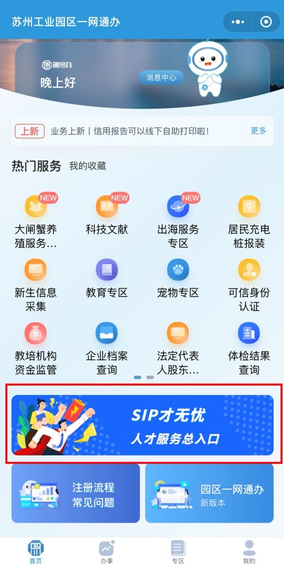 方式二:關(guān)注“蘇州工業(yè)園區(qū)發(fā)布”微信公眾號(hào),點(diǎn)擊下方“一網(wǎng)通辦”菜單欄,進(jìn)入后點(diǎn)擊“SIP才無憂”人才服務(wù)總?cè)肟凇?/p>