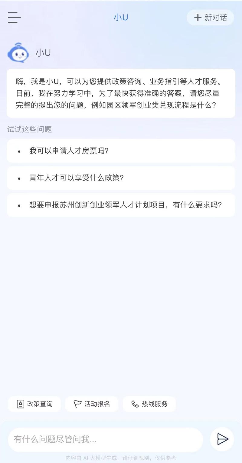 “SIP才無憂”深度聚焦提升人才的使用體驗(yàn),通過接入DeepSeek-R1“滿血版”,全新推出首個(gè)高智版AI助手“小U”,構(gòu)建智能化人才服務(wù)體系,實(shí)現(xiàn)“政策秒配、服務(wù)無界”。