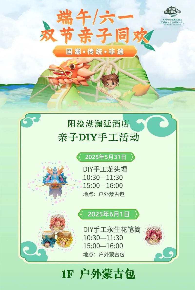 陽澄湖瀾廷酒店推出親子DIY手工活動,帶領大家親手制作龍頭帽、永生花筆筒,還有DIY非遺團扇、DIY漢服等豐富項目,讓游客們沉浸式感受端午氛圍,體驗中華優秀傳統文化魅力。