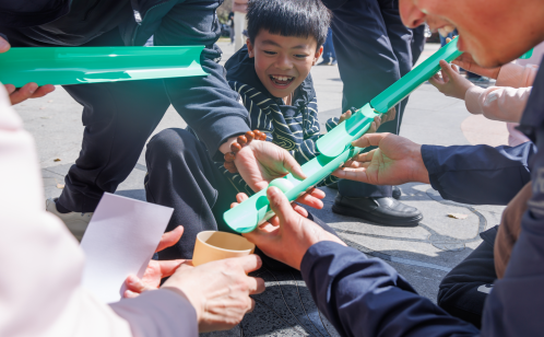 在“綱”點打卡處,“水系連連看”游戲吸引了眾多親子家庭踴躍參與。家長與孩子各持一段U型管,首尾相接,小心翼翼地護送藍色小球從“源頭”滾動至“大海”。小球在管道中蜿蜒前行,時而加速、時而緩行,每一次成功抵達都引來陣陣歡呼。“這個游戲很有意思,讓孩子明白了水是怎么通過管道輸送到很遠的地方。”一位家長笑著說。