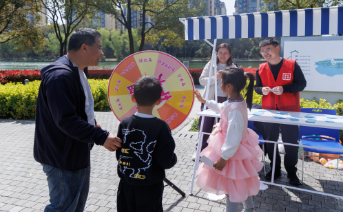 移步“目”點,節水大轉盤前圍滿了躍躍欲試的居民。轉盤轉動,指針停留,志愿者隨機抽取一道與場景相關的節水問題進行提問。“淘米水可以做什么?”“洗車時應該用什么方式更節水?”……孩子們爭先恐后地回答,答對者歡呼雀躍,答錯者也在志愿者的耐心科普中獲得重答機會。歡聲笑語間,節水知識悄然入心。