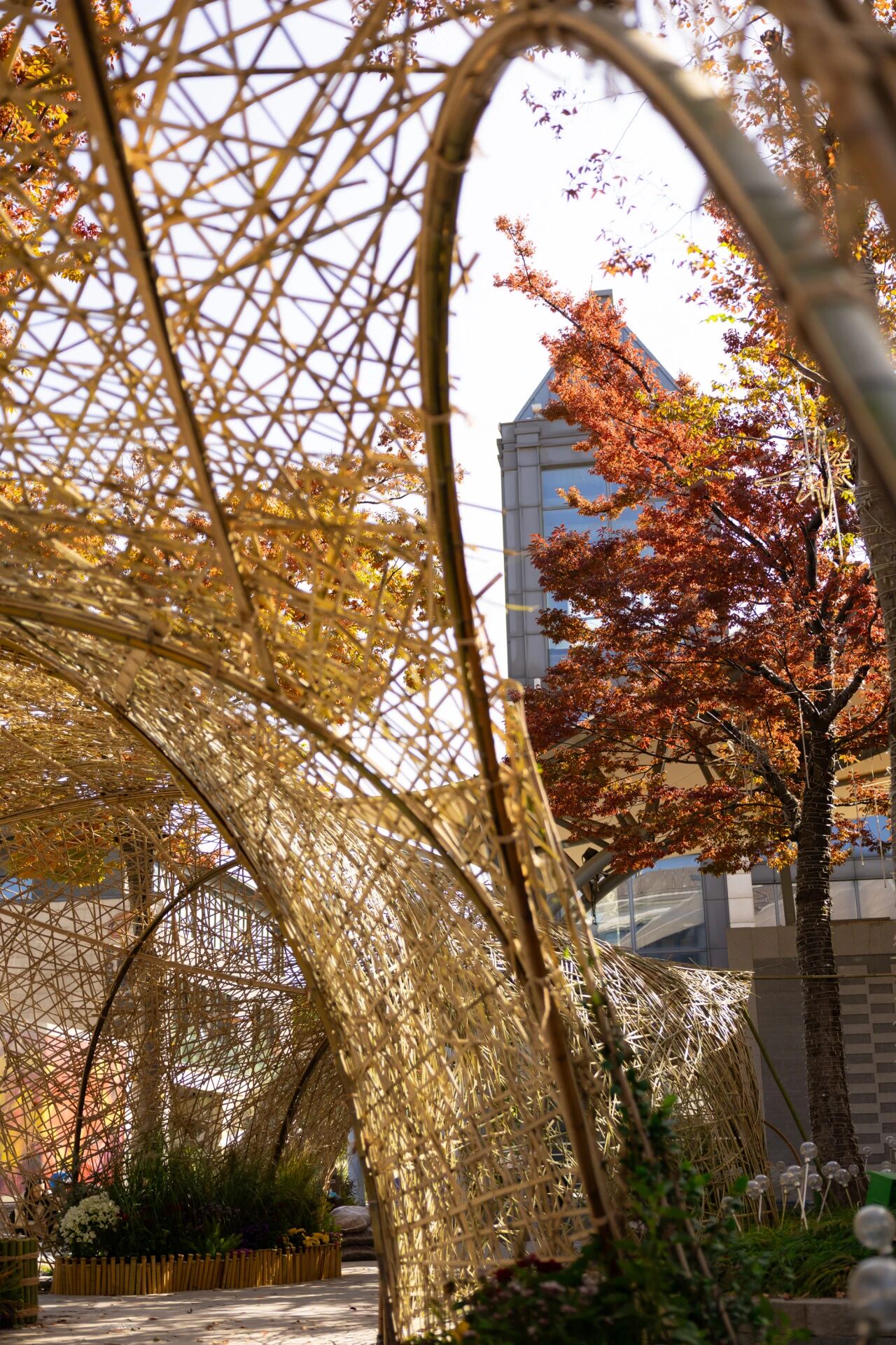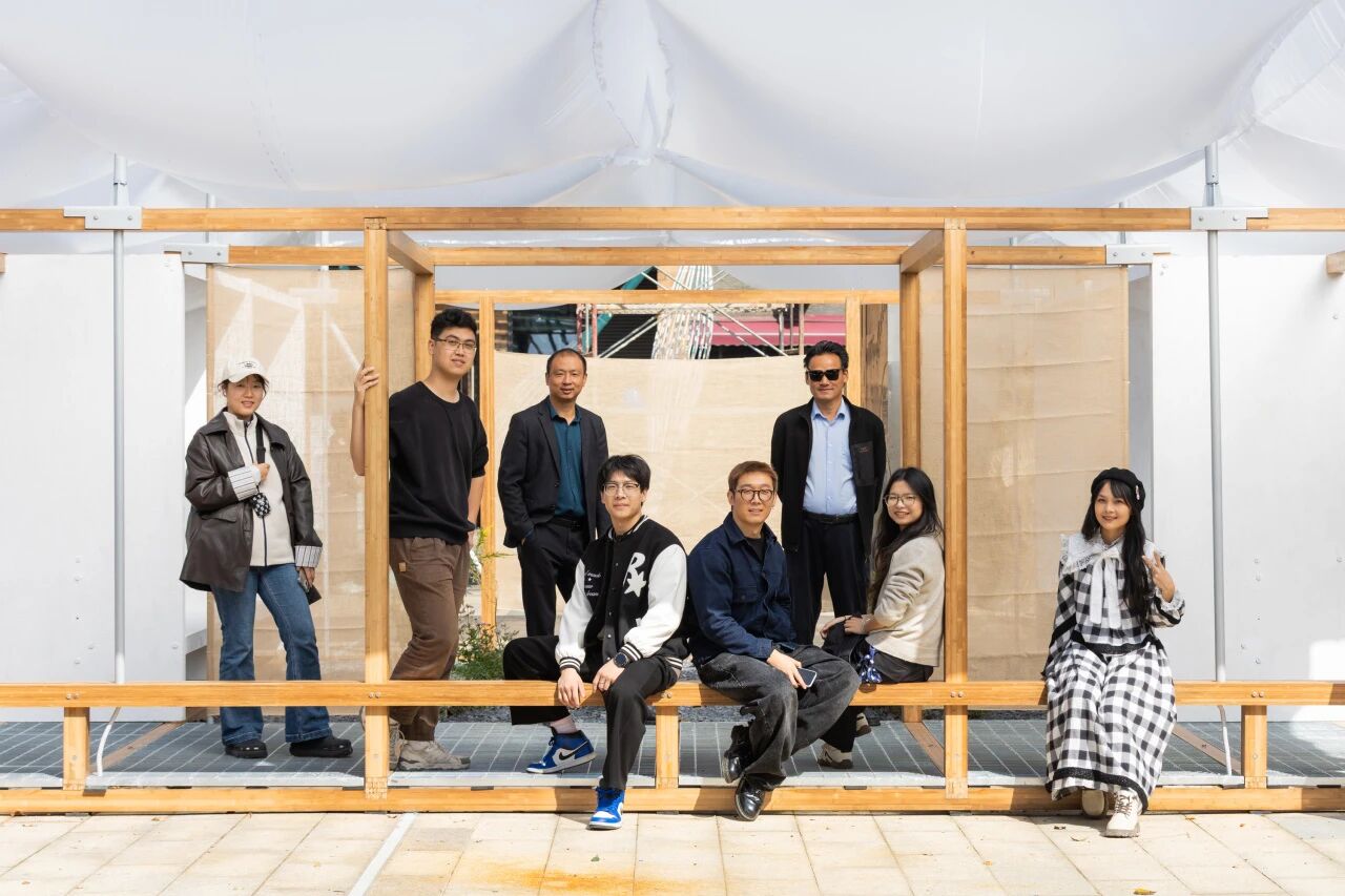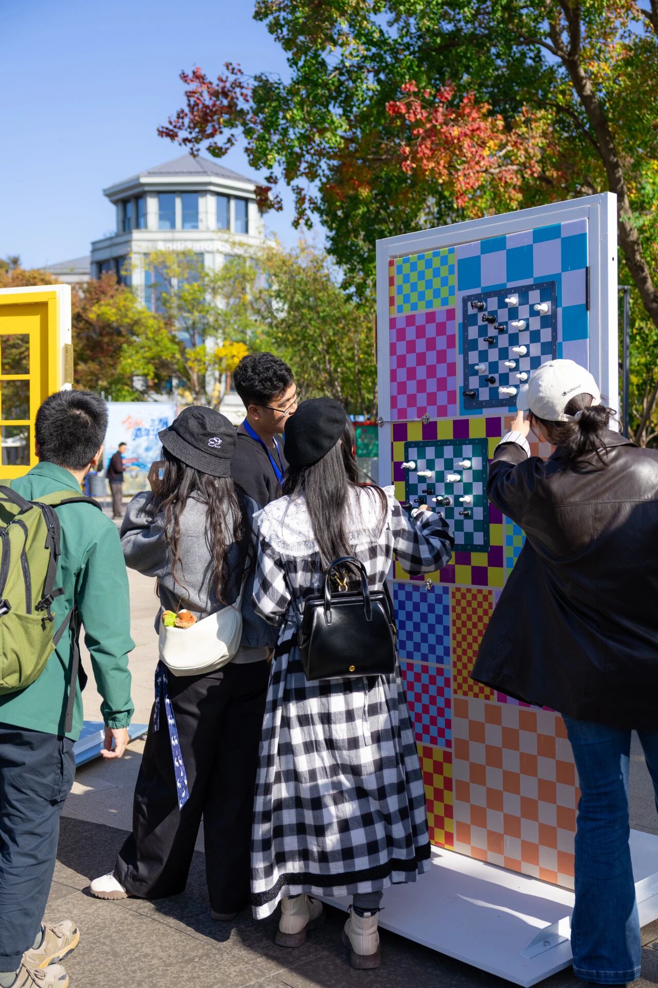其中,中央美術(shù)學(xué)院侯曉蕾團(tuán)隊(duì)的《竹有洞天》,以現(xiàn)代竹廊再現(xiàn)園林“移步換景”的意境精髓,并將非遺竹編技藝轉(zhuǎn)化為公眾可參與的互動(dòng)體驗(yàn);上海交通大學(xué)孫昊德團(tuán)隊(duì)的《雕塑的再生》,通過(guò)對(duì)既有水景雕塑的“輕介入”設(shè)計(jì),以木構(gòu)蔭棚與爬藤植物讓原有雕塑“再生”為充滿(mǎn)生命力的公共休憩節(jié)點(diǎn);蘇州大學(xué)羅輝團(tuán)隊(duì)的《呵嵐庭》,巧妙利用愛(ài)墻前空間,以竹木看臺(tái)與氣膜云燈屋頂打造出集活動(dòng)、休閑休憩與視覺(jué)引導(dǎo)于一體的多功能庭院;南京藝術(shù)學(xué)院曹斌華團(tuán)隊(duì)的《竹?息》嵌入街區(qū)廊橋,讓竹材進(jìn)行機(jī)械“呼吸”動(dòng)態(tài)展示,在傳統(tǒng)技藝與當(dāng)代科技的完美融合中訴說(shuō)著生命與記憶的永恒主題;南京林業(yè)大學(xué)何疏悅團(tuán)隊(duì)的《一日環(huán)游記》,以十二扇“時(shí)空之門(mén)”為核心藝術(shù)構(gòu)思,邀請(qǐng)市民在非線(xiàn)性穿行中重新審視日常生活的詩(shī)意,作品更融入商戶(hù)共創(chuàng)的巧思,街區(qū)內(nèi)高展設(shè)計(jì)、孟小冬藝術(shù)館、NapoliAndiamoCasa、尼古拉、明美術(shù)館、黑犬等商戶(hù)提供了店內(nèi)的椅子,與十二扇門(mén)共同構(gòu)成完整藝術(shù)裝置,讓商業(yè)空間與公共藝術(shù)自然交融。